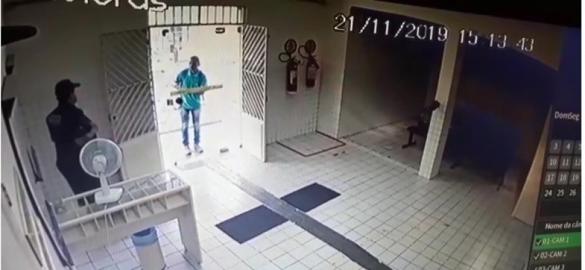 O bandido de camisa azul pede para o vigilante abrir a porta de vidro para ele. Percebendo a movimentação estranha, o vigilante se recusa a abrir, e é quando o ladrão tenta abrir a porta já sacando a arma.